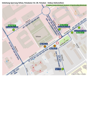 Die Haltestelle Teltow, Warthestr. wird zu einer Ersatzhaltestelle in der Neißestraße (nach der Einmündung Potsdamer Straße, außer Linien X10 und 629) und zu einer Ersatzhaltestelle in der Rheinstraße (vor der Kreuzung Warthestraße, alle Linien) verlegt.